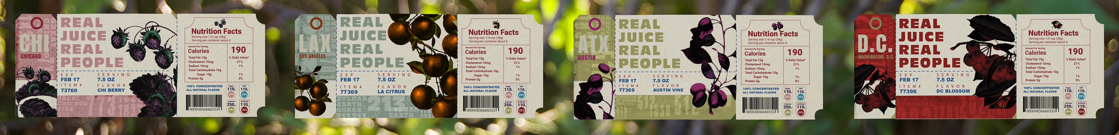 The design has a retro and organic style that evokes nostalgia and the simplicity of drinking juice. Each drink is named after a city, such as Los Angeles, Chicago, DC, Austin, and is associated with a specific fruit represented uniquely as a plane ticket.